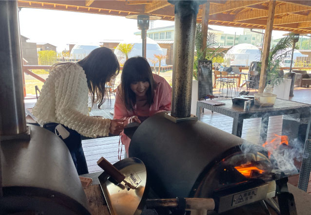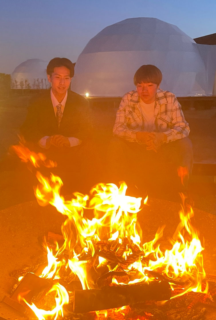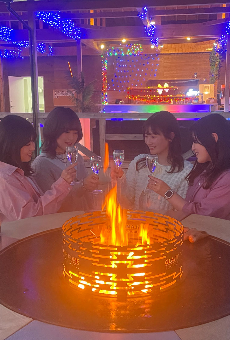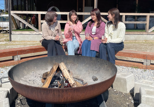 焚き火を囲んで女子会スタート!スタンディング仕様の特注焚き火、座って暖を取れる焚火でお酒が進む!